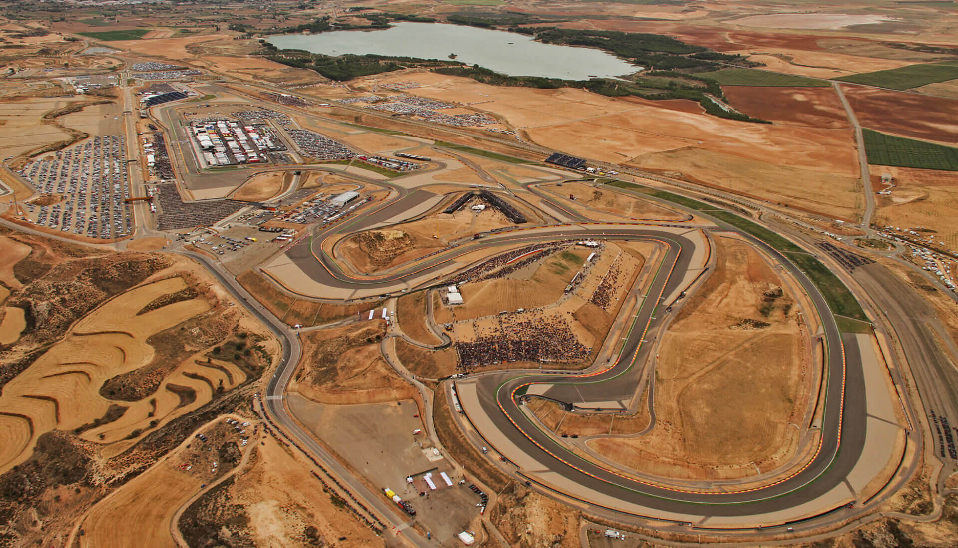 Motorland Aragón is located in the Teruel province in Aragón, roughly midway between Madrid and Barcelona, It can be found alongside the N-232, a few miles north west of Alcañiz. The nearest internaltional airport is at Zaragoza, 74 miles away (120km).