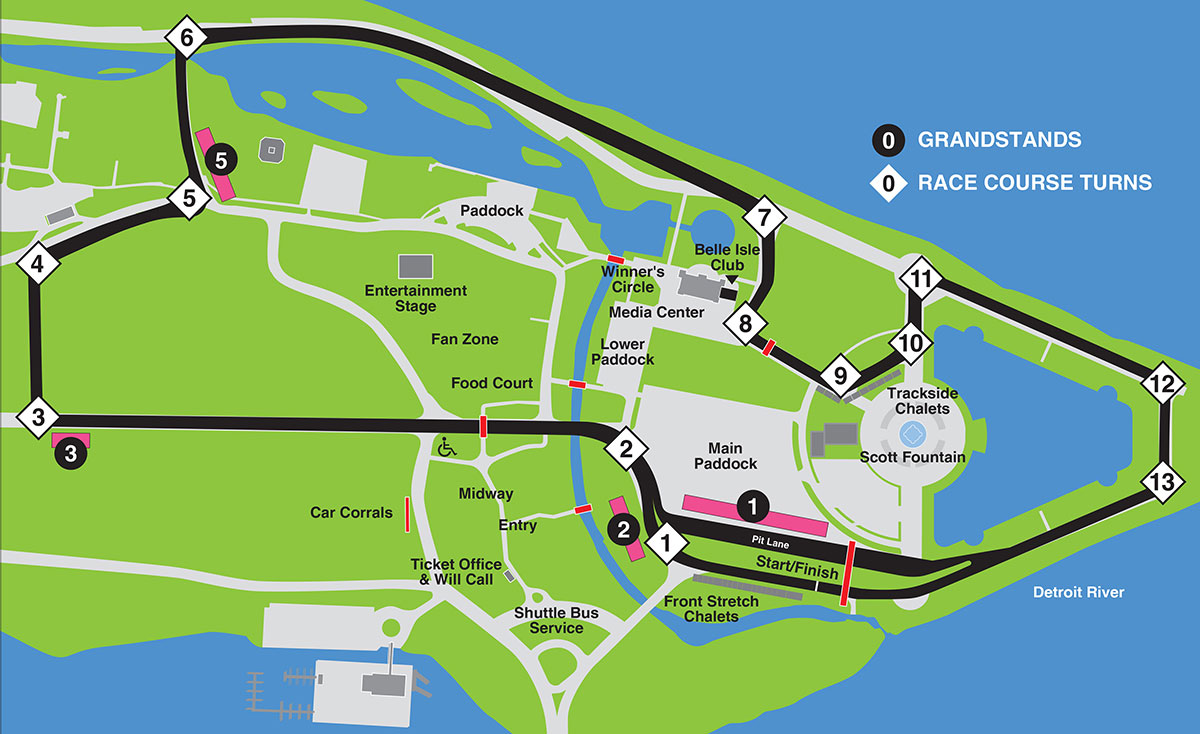 The circuit is located on Belle Island, Detroit and is only by the MacArthur Bridge to downtown Detroit. On race weekends, The Isle is for Sole use of the race events and as such all parking is not permitted with all race attendees being required to use the organised services of shuttle buses. These run continuously from convenient locations in downtown Detroit. There is also a ferry service runnning from Detroit Port Authority Building, located at 120 Atwater Street, to the Harbormaster Station. Boats run to/from Belle Isle approximately every 30 minutes daily, between 6:30 a.m. and 8:30 p.m., during the event.