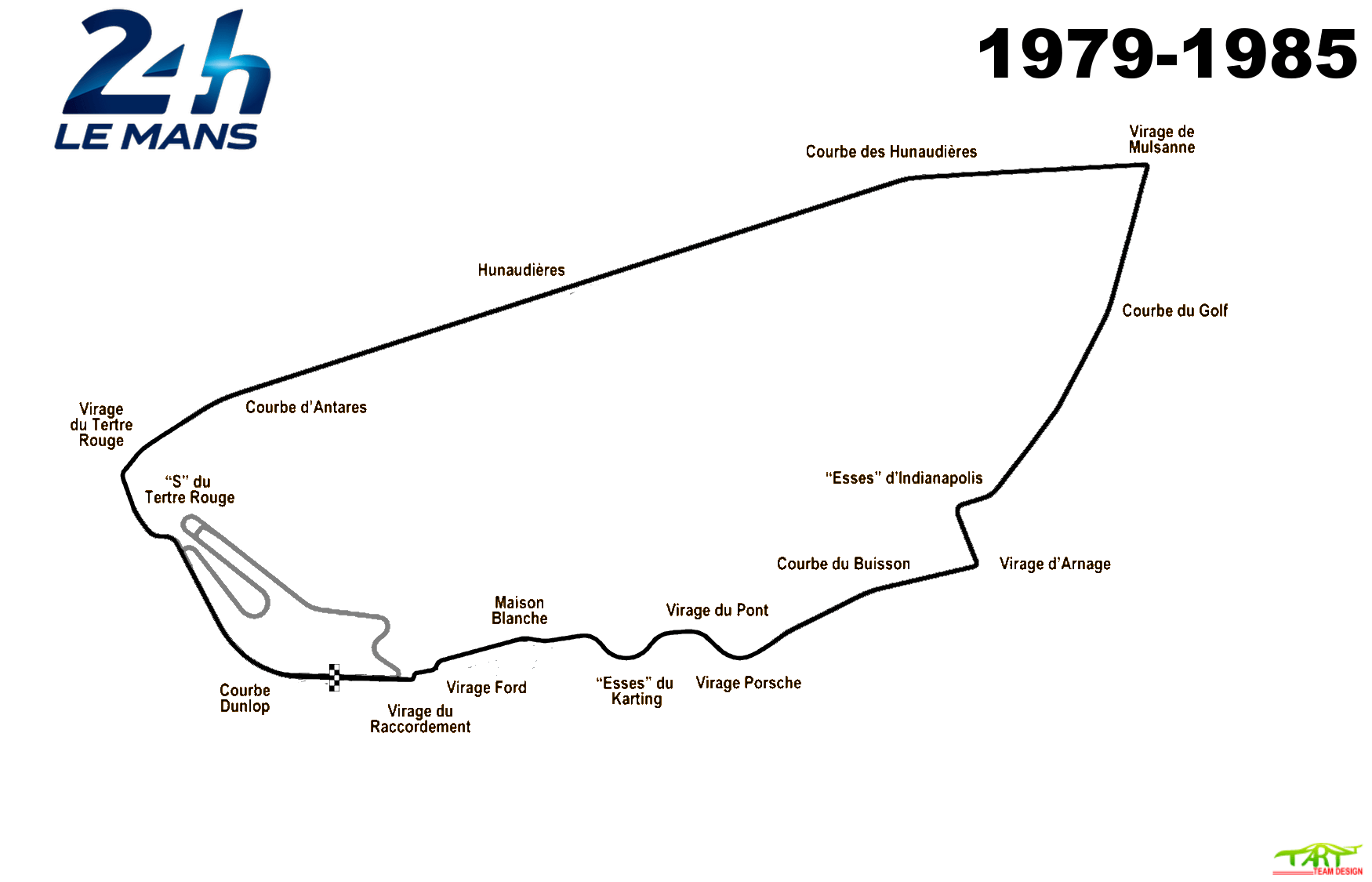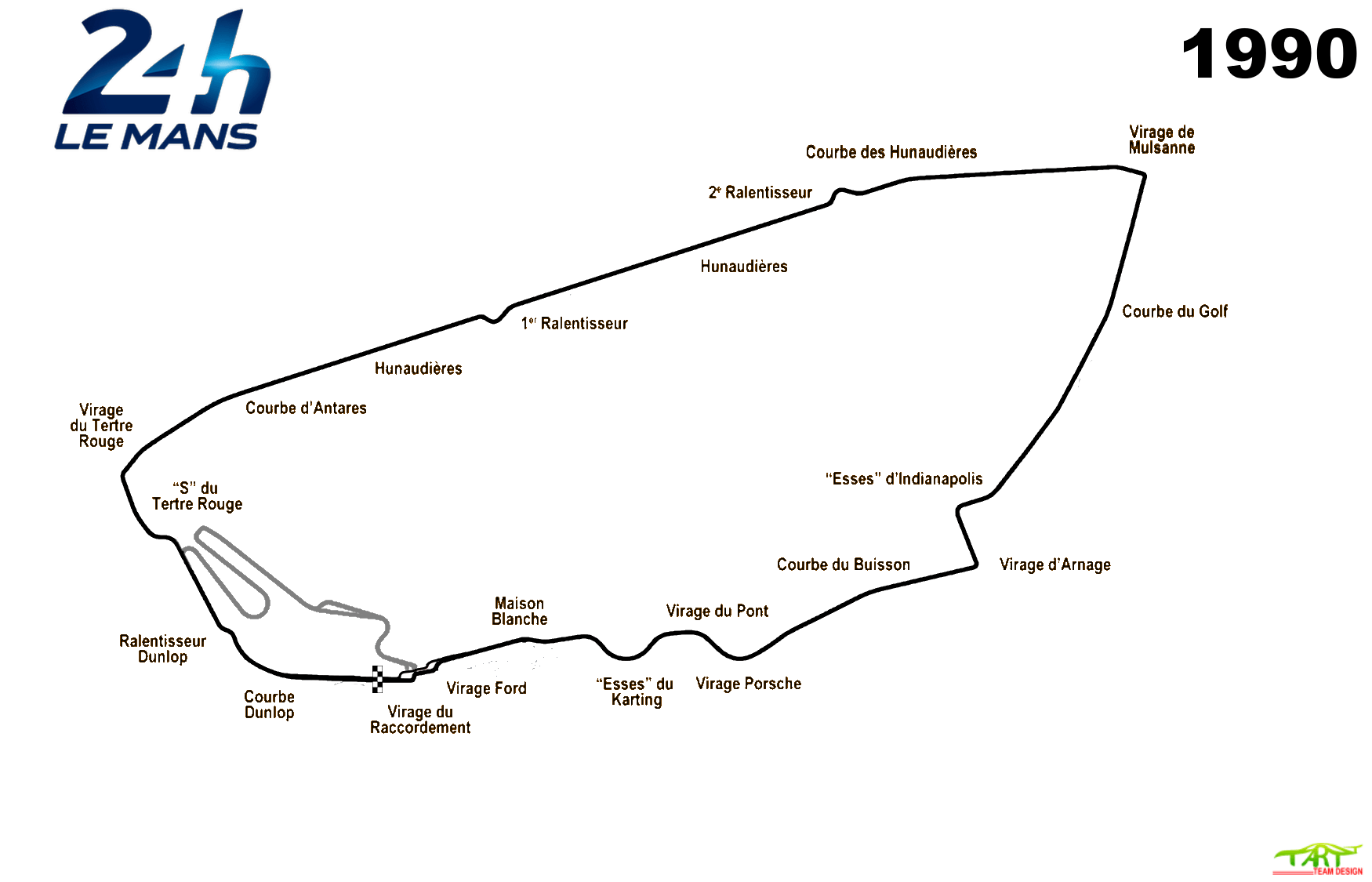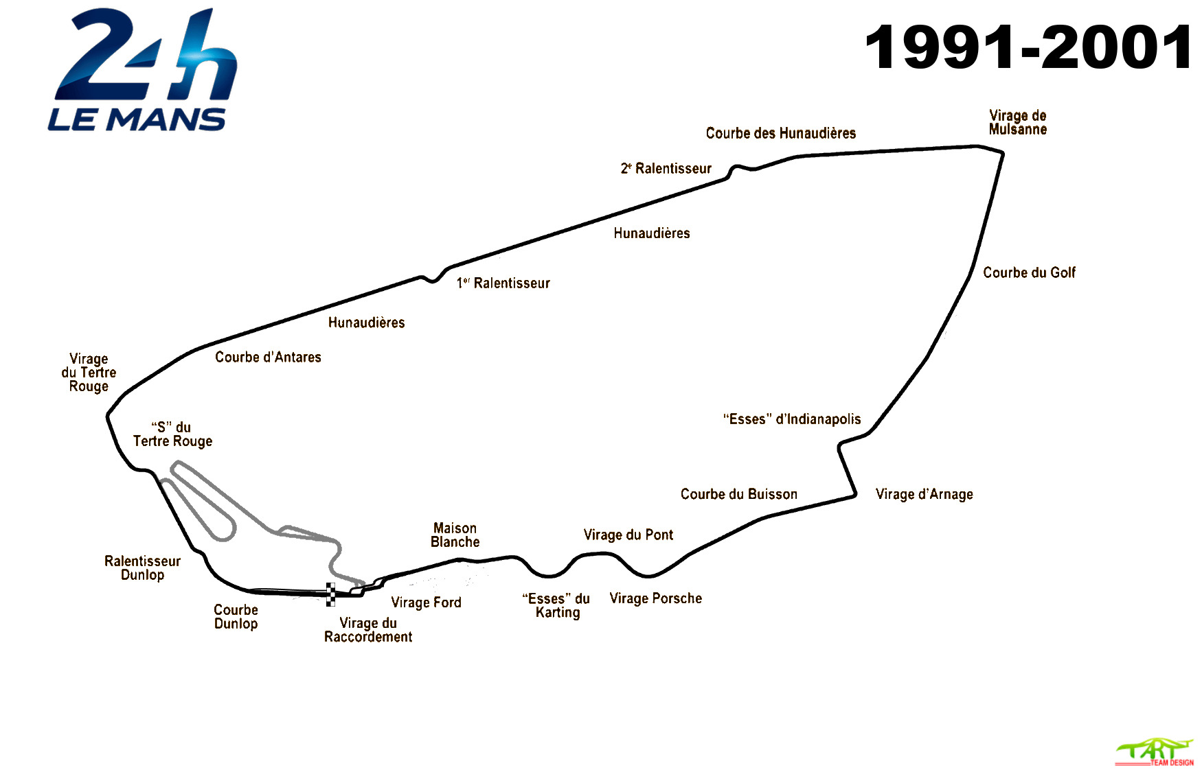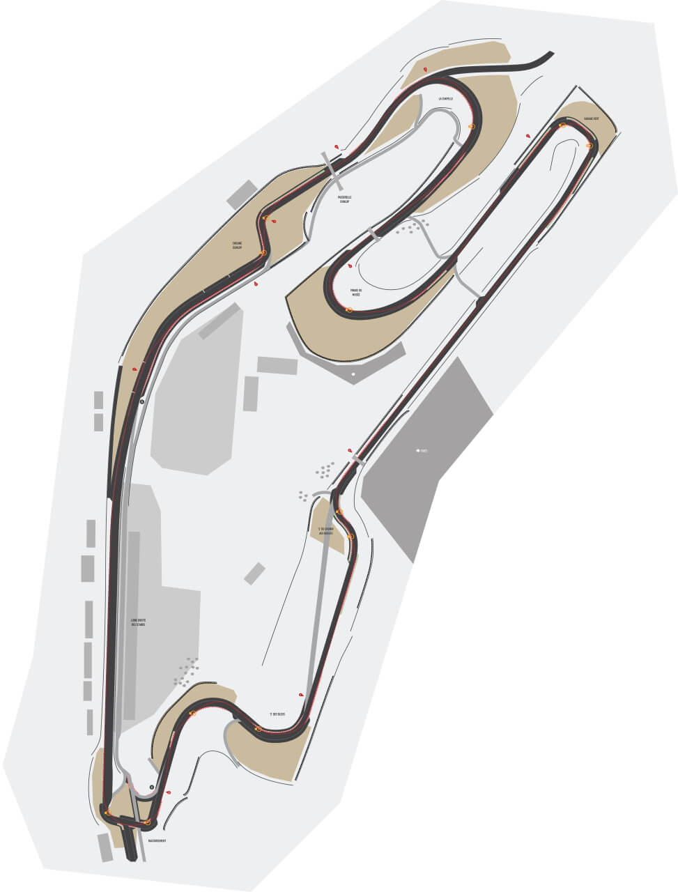 The circuit remains on public roads through the gently banked Indianapolis and Arnage corners before it diverges for the Porsche Curves, which bypass the old Maison Blanche section. It then ultimately returns to the Bugatti circuit at the Ford Chicane.