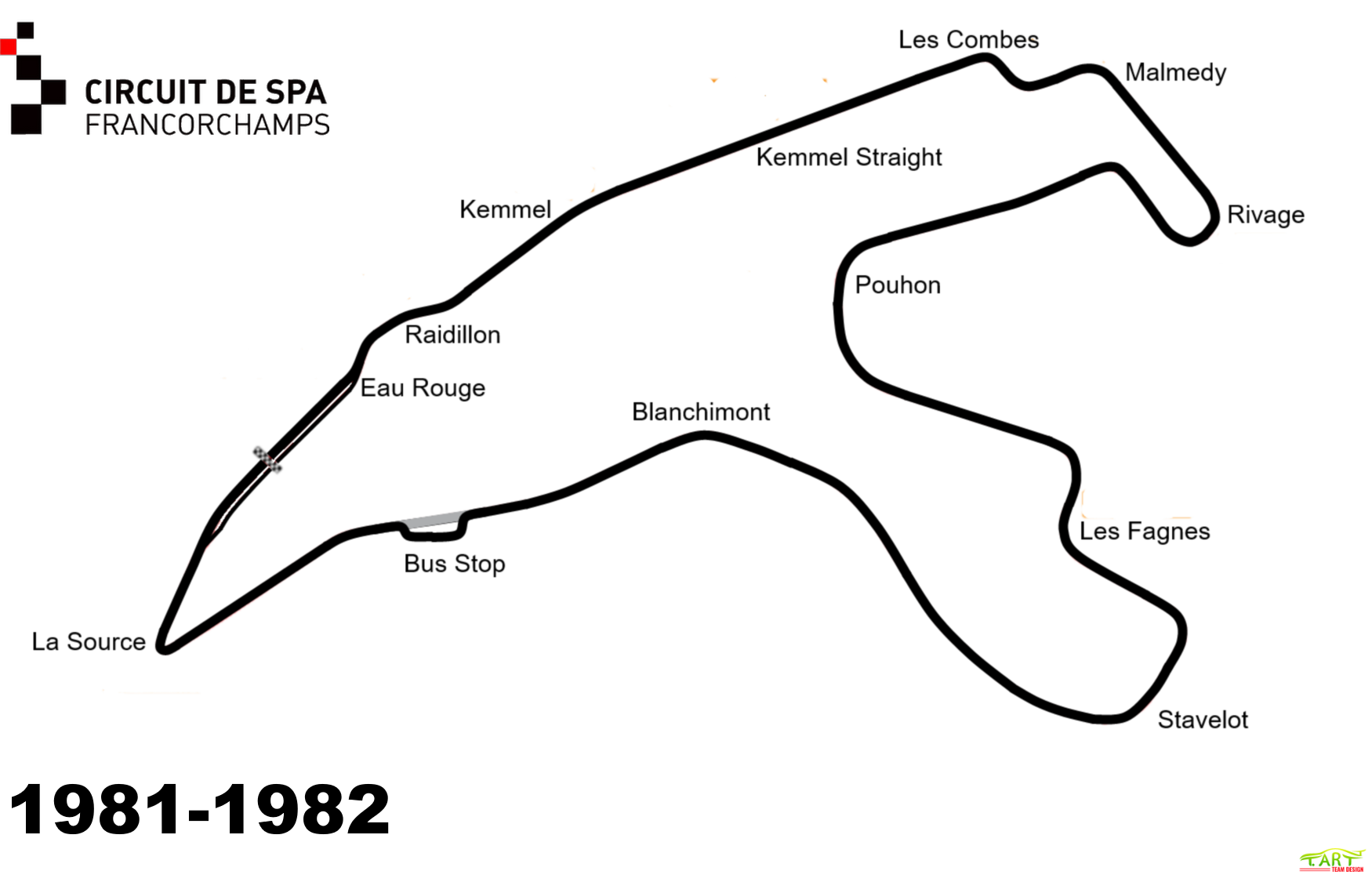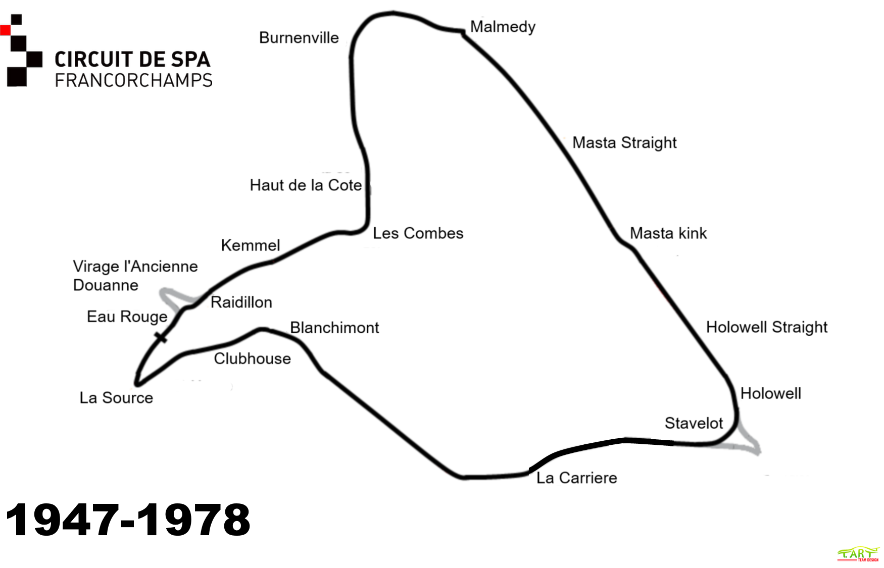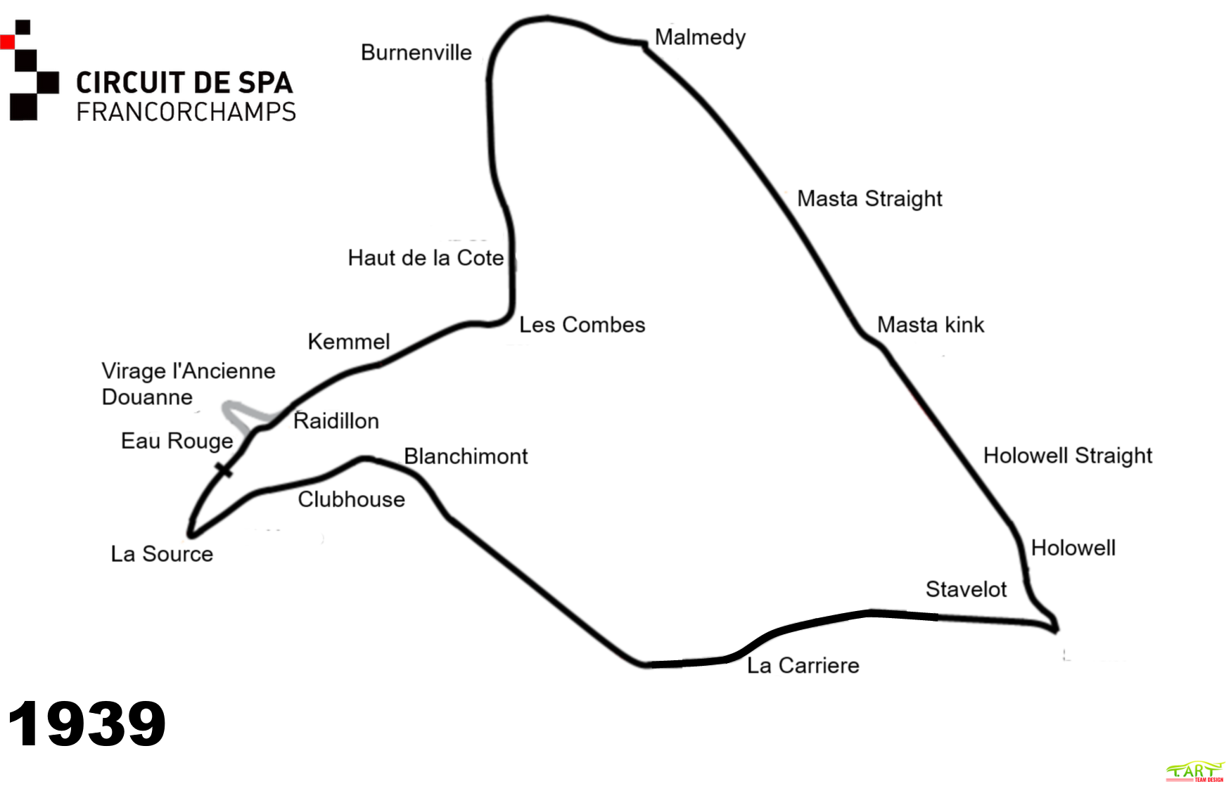 The old race track continued through the now-straightened Kemmel curves to the highest part of the track (104 metres above the lowest part), then went downhill into Les Combes, a fast, slightly banked downhill left-hander towards Burnenville, passing this village in a fast right hand sweep. Near Malmedy, the Masta straight began, which was only interrupted by the fast Masta Kink between farm houses before arriving at the town of Stavelot. Then the track blasted through an uphill straight section with a few kinks called La Carriere, going through 2 ultra-fast turns (an unnamed right-hand turn and then Blanchimont) before braking very hard for the La Source hairpin, and that rejoined the downhill start finish section as opposed to today where the start-finish section is before La Source.