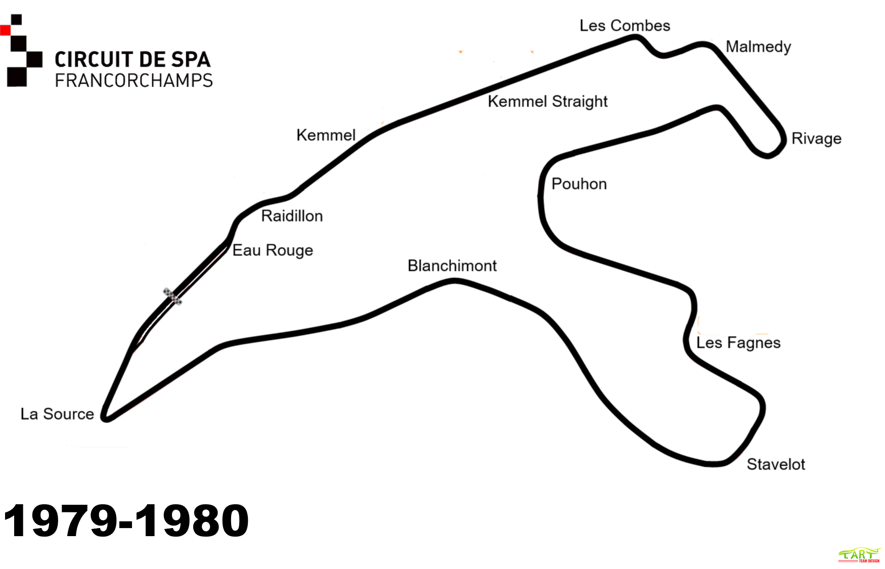 After Masta, and at the end of the subsequent Holowell Straight, there used to be a sharp hairpin at the entrance to the town itself, which was later bypassed by a quicker, banked right hand corner. Another fast section of road in the forest leads to Blanchimont. Here, the new short Grand Prix track of 1979 joins the old layout.