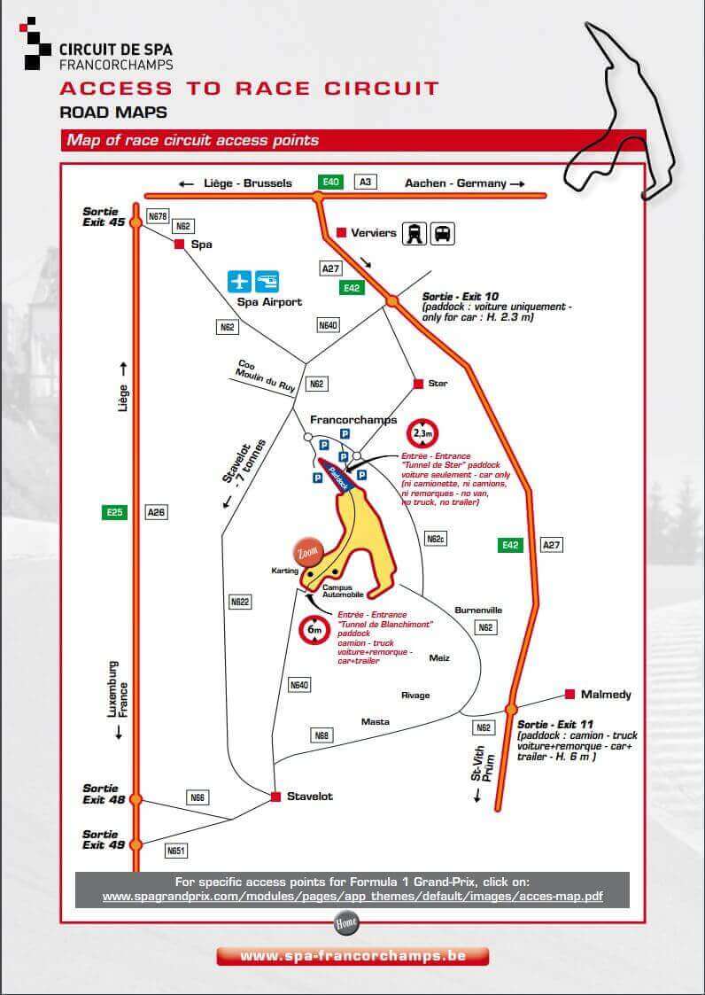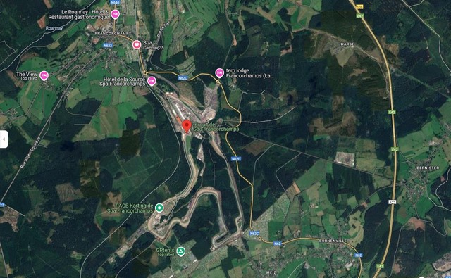 The Circuit de Spa-Francorchamps can be found near to the town of Francorchamps in eastern Belgium, close to the borders with Germany and the Netherlands. If you are flying to Spa, there are plenty of choices thanks to the circuit's central European location. The nearest international airport is actually over the border in the Netherlands; Maastricht Aachen Airport is approximately a 50 minutes drive from the circuit. An alternative airport with international flights can be found at Düsseldorf, Germany (a 90 minute drive away. The nearest major airport in Belgium is at Brussels Airport is an 85 mile drive (80 mins) away, but some international and domestic flights can also be found at South Charleroi Airport, which is also about an 80 minute drive.